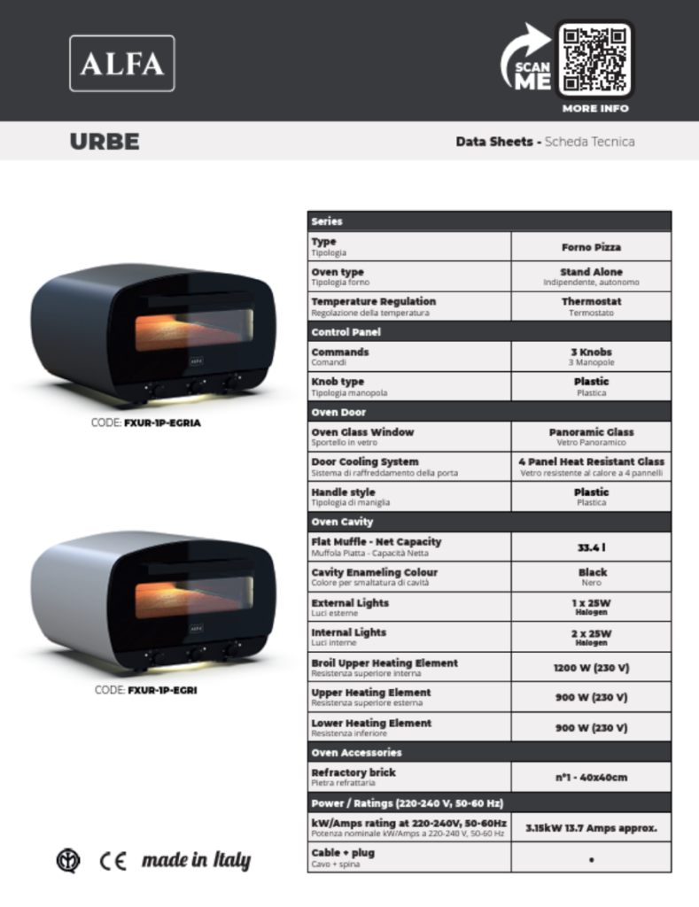 - Urbe è il nuovo forno elettrico Alfa, progettato e certificato per uso domestico interno, ideale per chi vuole godersi autentiche pizze napoletane a casa con facilità e stile.