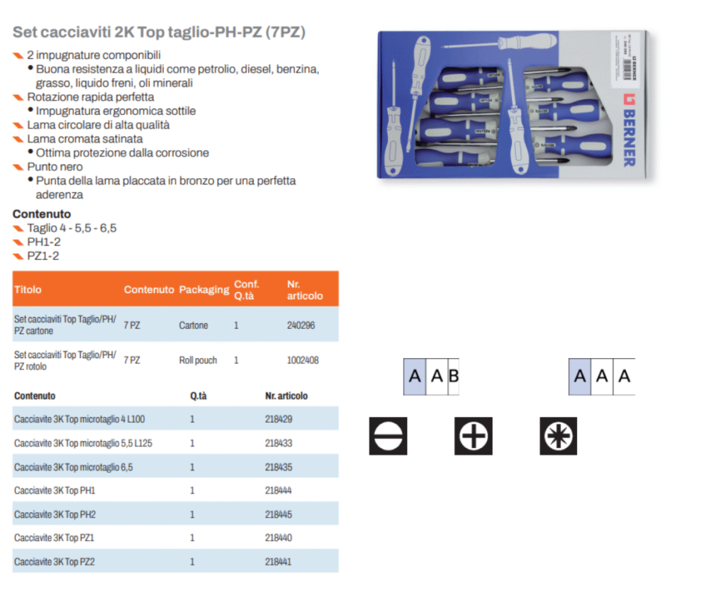 - Il set di cacciaviti BERNER 7 pezzi offre una presa sicura e confortevole con impugnature componibili e resistenza ai liquidi.