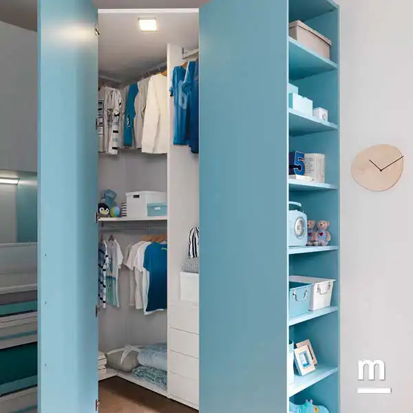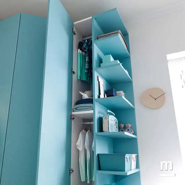 - Design e funzionalità per la cabina armadio con terminale Liberty, un elemento largo 60 cm composto per metà da un modulo con ripiani e tubi appendiabito e per l’altra metà da una parte a giorno con ripiani. Quando si chiude l’anta, il modulo rimane aperto nella profondità e assume l’aspetto di una libreria.