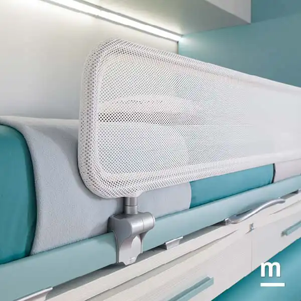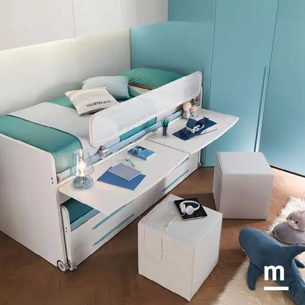 - Il sistema letto Space è dotato di due letti, sei cassetti e due scrivanie. Per il letto più alto c’è la protezione Web Split a ribalta in tubolare di metallo (25 mm di diametro) con chiavetta di sicurezza: in questo modo la protezione può essere sbloccata solo attivando il meccanismo di fissaggio, per esempio nel momento in cui è necessario rifare il letto.