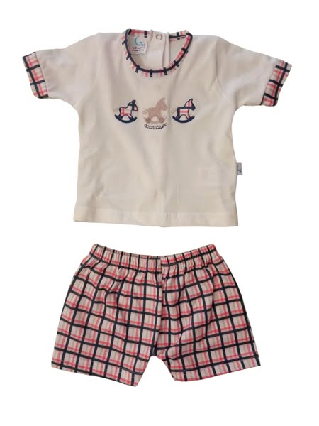 - Questo set include una morbida maglietta a maniche corte con un adorabile disegno di cavalli a dondolo sul davanti,