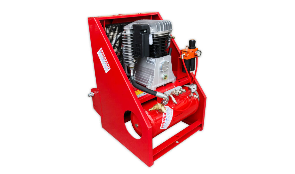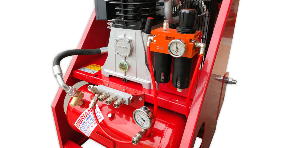 Di serie è prodotto con 5 uscite ad attacco rapido per aria compressa ma il numero di esse può essere aumentato con l’utilizzo di semplici sdoppiatori.Grazie al suo serbatoio da 24 litri è in grado di azionare 4 abbacchiatori pneumatici oppure fino a 8 forbici pneumatiche contemporaneamente oppure 2 seghetti pneumatico da potatura.