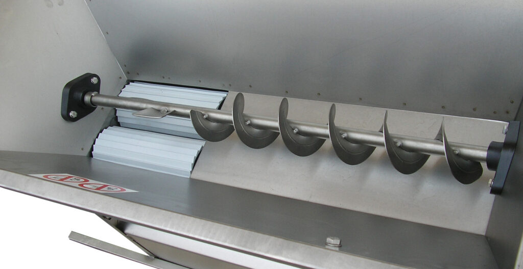 All’interno della tramoggia si trova una coclea, in acciaio inox, adibita al costante trascinamento del prodotto all’interno dei rulli.