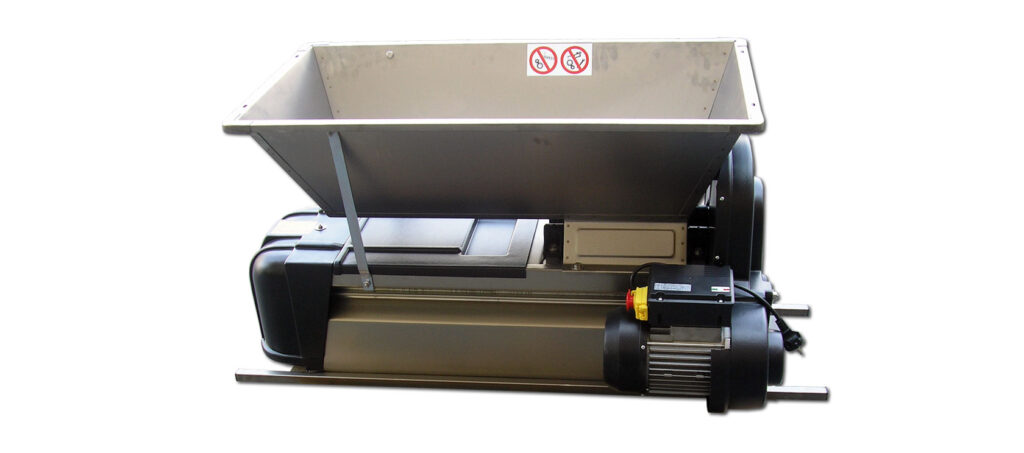 Un potente motore montato sulla macchina muove tutti i vari meccanismi, quali i rulli per la pigiatura, la coclea superiore e l’albero diraspatore che separa l’acino dal raspo tramite una griglia estraibile in acciaio Inox.