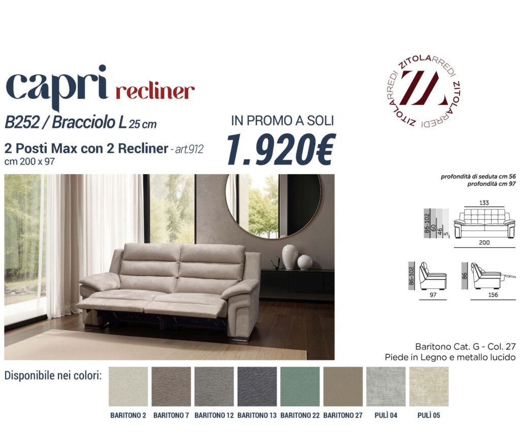 - Trasforma il tuo living in un’oasi di puro relax con il divano Capri Recliner (modello B252). Progettato con una linea moderna e volumi accoglienti, questo divano si distingue per la cura dei dettagli e la qualità dei materiali.