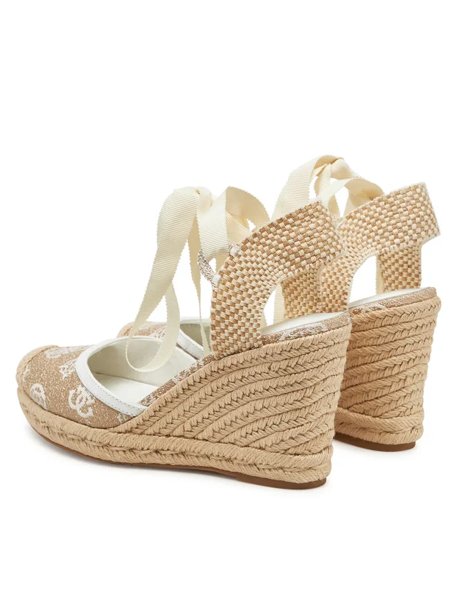 - Espadrillas eleganti in tessuto beige con zeppa, fibbia decorativa e lacci in raso.