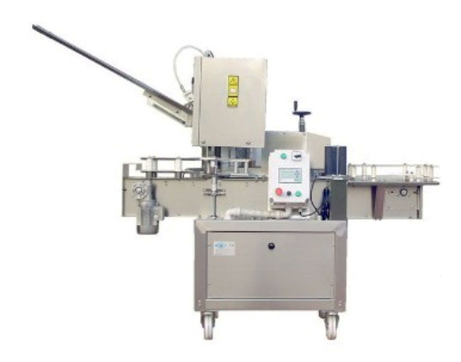 Macchina attrezzata con distanziatore bottiglie in ingresso, distributore di capsule, testata termica e stazione di etichettatura