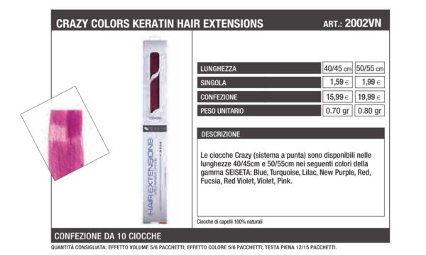 Le ciocche Crazy (sistema a punta) sono disponibili nelle lunghezze 40/45cm e 50/55cm nei seguenti colori della gamma SEISETA: