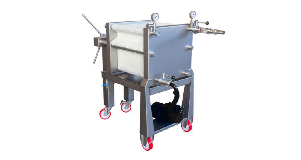 Filtro a piastre 40×40 studiato per brillantare e sterilizzare vini bianchi e rossi, spumanti, olii di oliva, liquori a bassa gradazione e prodotti di erboristeria.