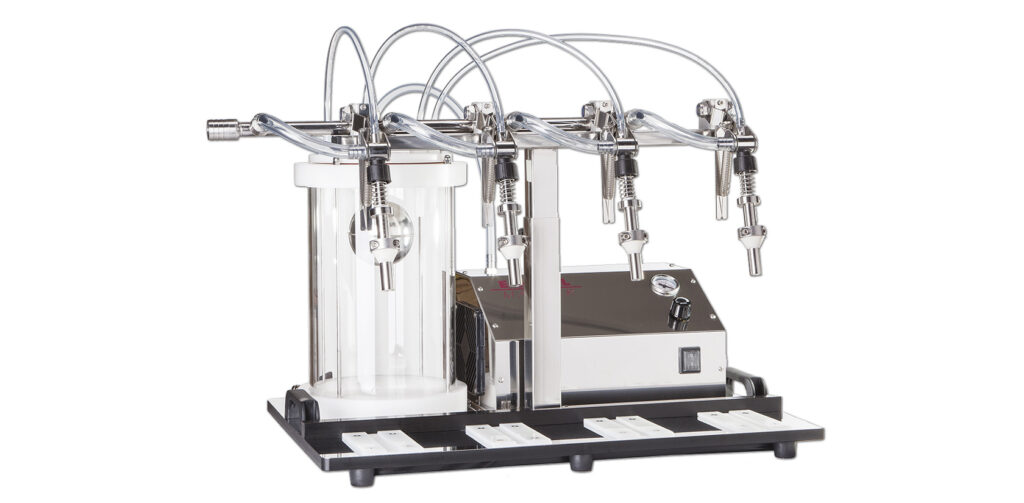 Infatti, il liquido viene richiamato dal vuoto che la macchina crea all´interno delle bottiglie appena queste vengono inserite; di conseguenza, il riempimento avviene senza scuotimenti e senza alcun contatto con pompe o organi meccanici.