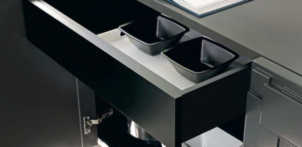 Madia contenitore in legno e ante in poliuretano rigido laccato bianco (OP7) o graphite (OP69) opaco. Piedini in acciaio inox lucido, verniciati bianco (OP71) o graphite (OP69) opaco. Ripiani interni in cristallo trasparente. Optional: cassetto interno posizionabile su ognuna delle ante.