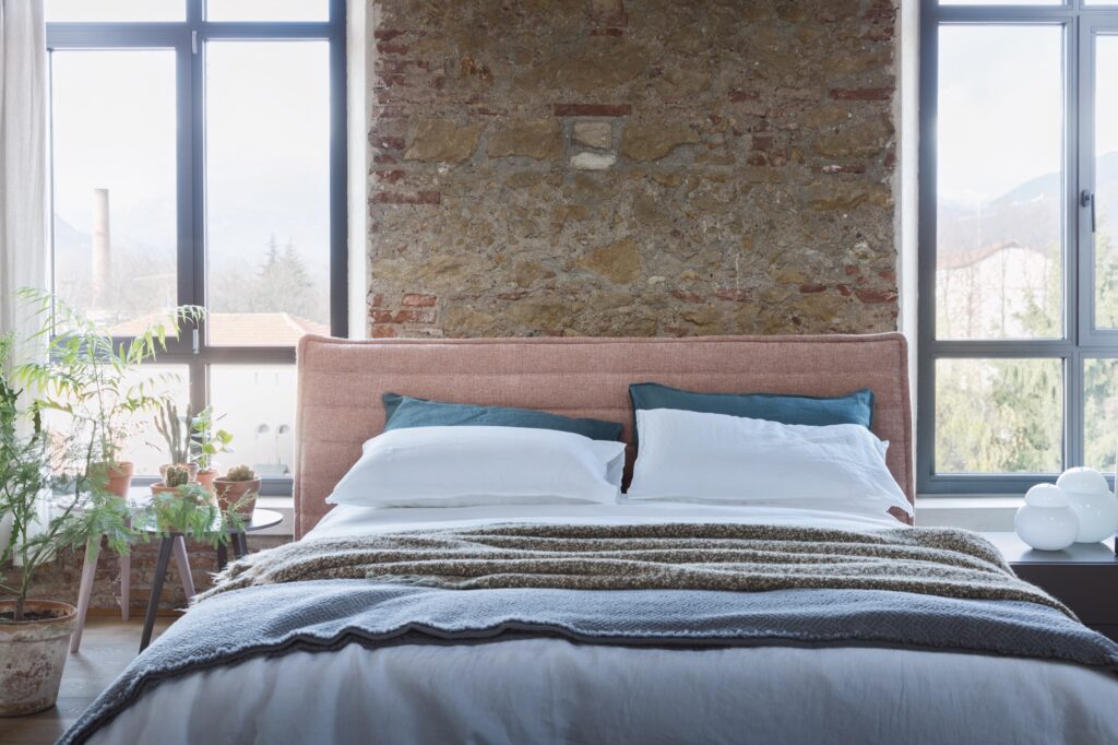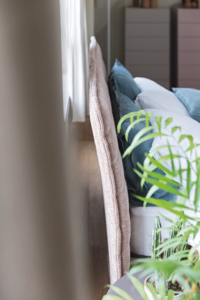 Il letto prende il nome dalla caratteristica lavorazione con cucitura a fasce della sottile testiera imbottita e sfoderabile. Il giroletto è disponibile anche con contenitore o con eleganti gambe coniche.