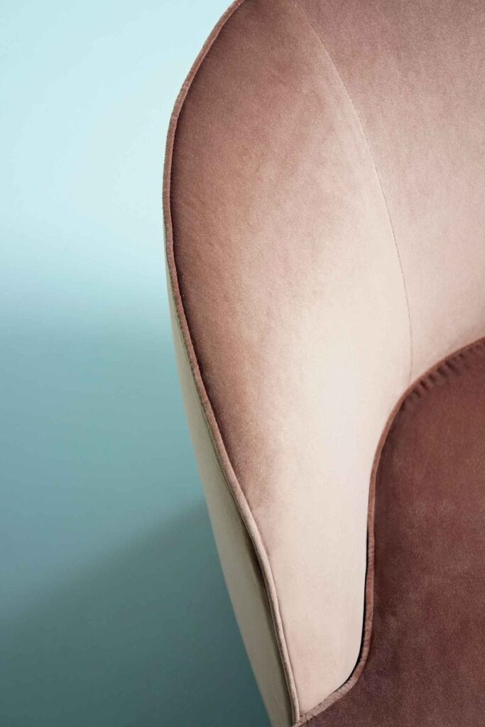 Una proposta che trova la sua collocazione ideale nella zona notte ma capace, grazie alla sua delicata eleganza, di inserirsi a pieno titolo anche in altri ambienti. Lo schienale dalla forma curvata è un vero e proprio guscio che racchiude la seduta monolitica, invitando al massimo relax. Cuciture e impunture ne rivelano le linee sinuose e delicate evidenziandole.