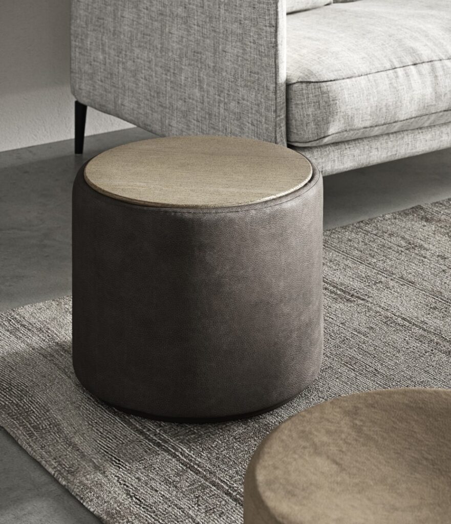 - La superficie superiore, disegnata in forma concava, permette di appoggiare comodamente il vassoio in laccato o essenza che lo completa, trasformandolo in un pratico e utile piano di appoggio.