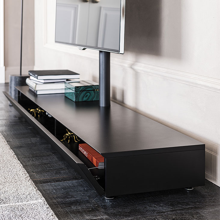Porta TV con supporto orientabile di 15°, base verniciata goffrato bianco (GF71) o nero (GF73) e anta a ribalta. Portata massima per TV kg 40. Predisposto attacco Vesa 75, 100, 200, 300 e 400.