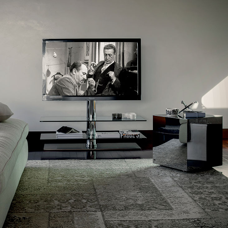 Porta TV girevole. Struttura cromata (08), ripiani in cristallo trasparente e base in acciaio inox satinato, con passacavi. Portata massima per TV: kg 40; ripiani kg 10 distribuiti.