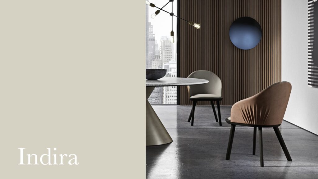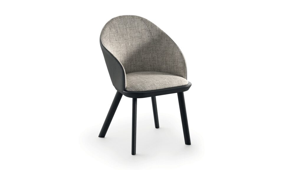 La forma dello schienale, avvolgente ed organica, è messa ancor più in risalto nella versione a contrasto o plissettata.
