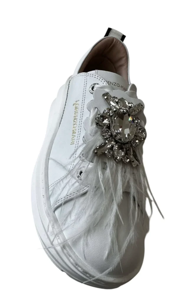 - La sneaker Veronica presenta un design monocromatico ed è realizzata con un accessorio oversize in strass e piume che può essere rimosso, conferendo alla sneaker un design semplice.