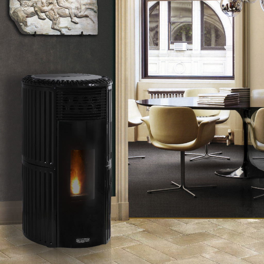 - Stufa a pellet compatta dal design pulito e lineare, top e fianchi in maiolica dal design esclusivo.