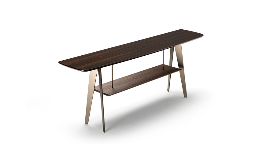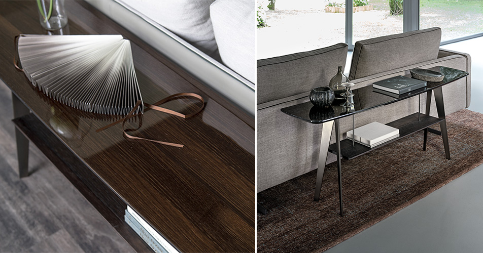 PIANI DEL TAVOLINO E DELLA CONSOLLE: MDF impiallacciato: piano inferiore in rovere moka e piano superiore in rovere moka laccato poliestere lucido oppure MDF impiallacciato sucupira per entrambi i piani.