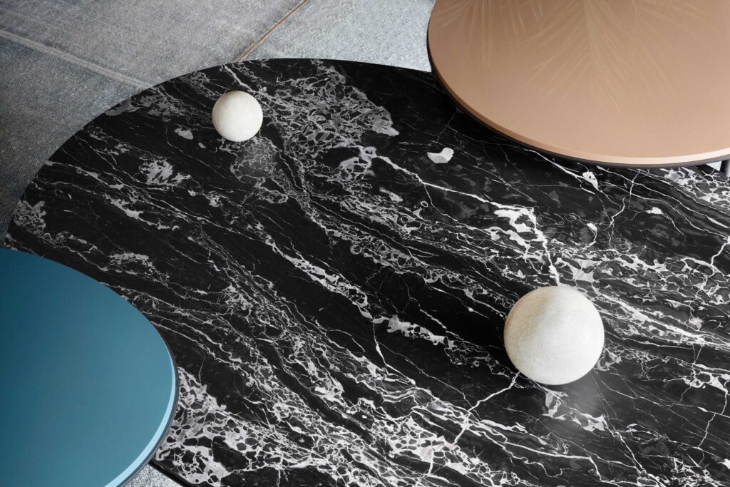 La struttura è in metallo verniciato mentre i top sono proposti in laccato lucido e opaco, legno, marmo e pietra.