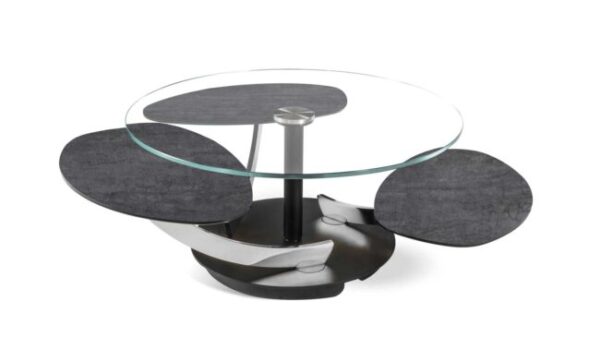 Tavolino estensibile dotato di un innovativo meccanismo che, attraverso la sola rotazione del piano superiore, permette ai tre pianetti sottostanti di aprirsi.