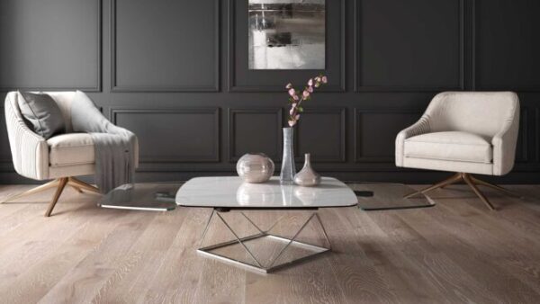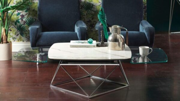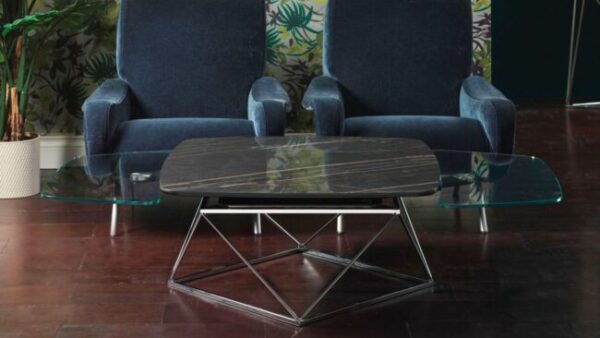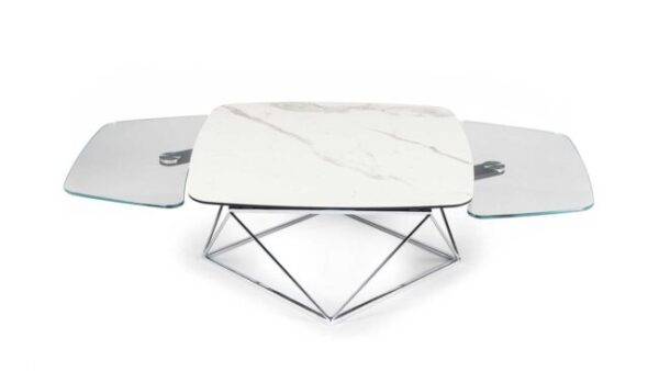 - tavolino estensibile con piani in ceramica e cristallo, base in acciaio verniciato o galvanizzato.