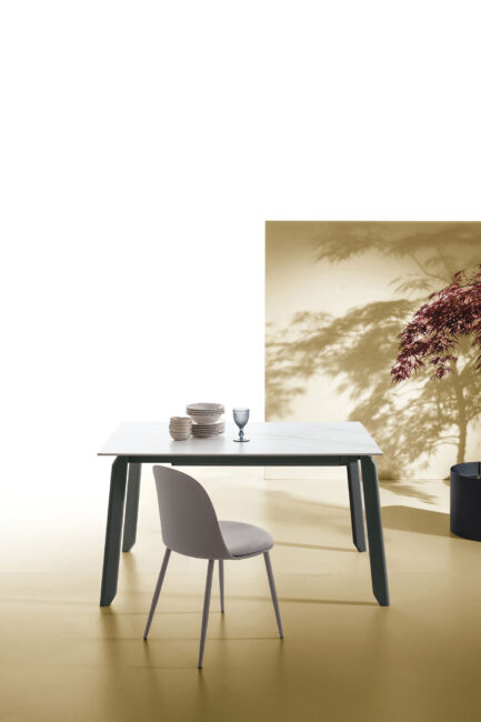 Tavolo allungabile con struttura in metallo verniciato. Piano rettangolare in gres porcellanato, vetro temperato o vetro con stampa digitale e allunghe laterali estraibili in MDF laccato in tinta con il piano o con la struttura.