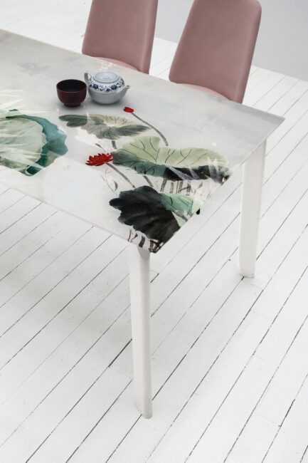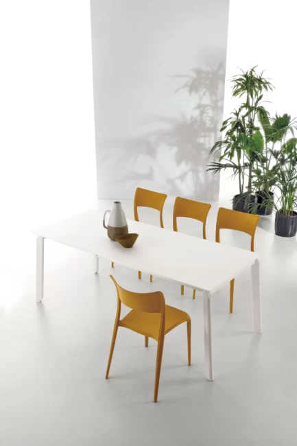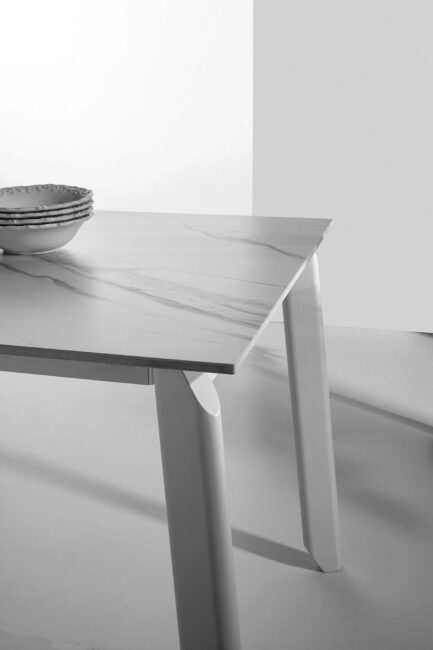 - Piano rettangolare in gres porcellanato, vetro temperato o vetro con stampa digitale e allunghe laterali estraibili in MDF laccato in tinta con il piano o con la struttura.