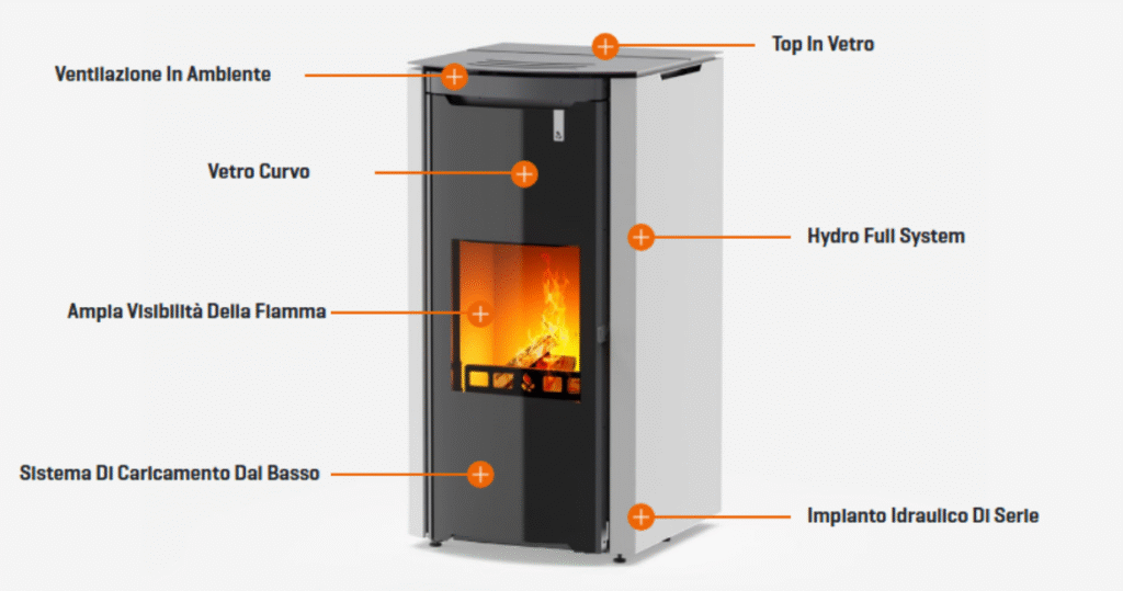 - Termostufa Ibrida Legna-Pellet Automatica con Alimentazione a Sorgente Autopulente