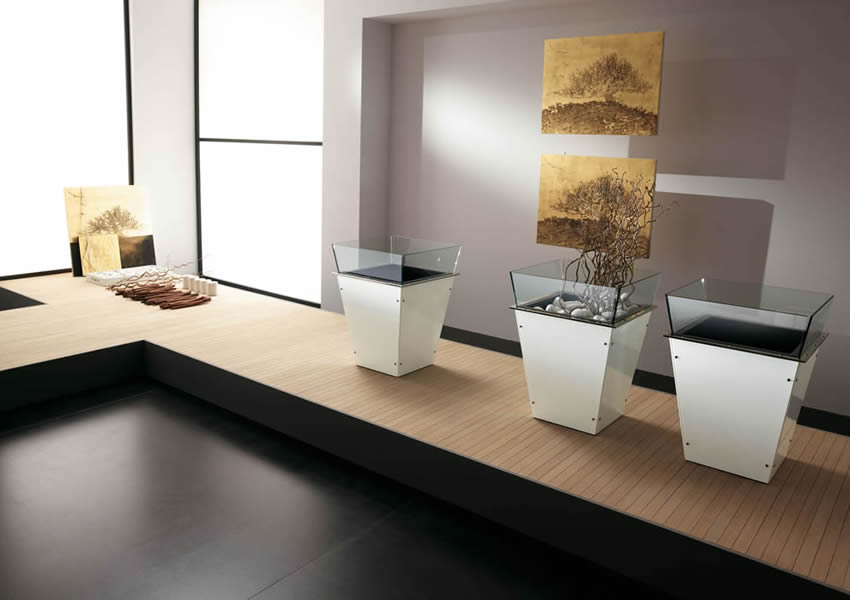 Vaso free standing disponibile in 3 diverse dimensioni. Pannelli laterali intercambiabili in molteplici finiture legno, vetro, specchio o cuoio. Il sistema di illuminazione degli elementi in vetro è opzionale.