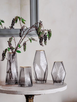- Vaso realizzato in vetro trasparente grigio con effetto martellato e bordo in oro lucido.