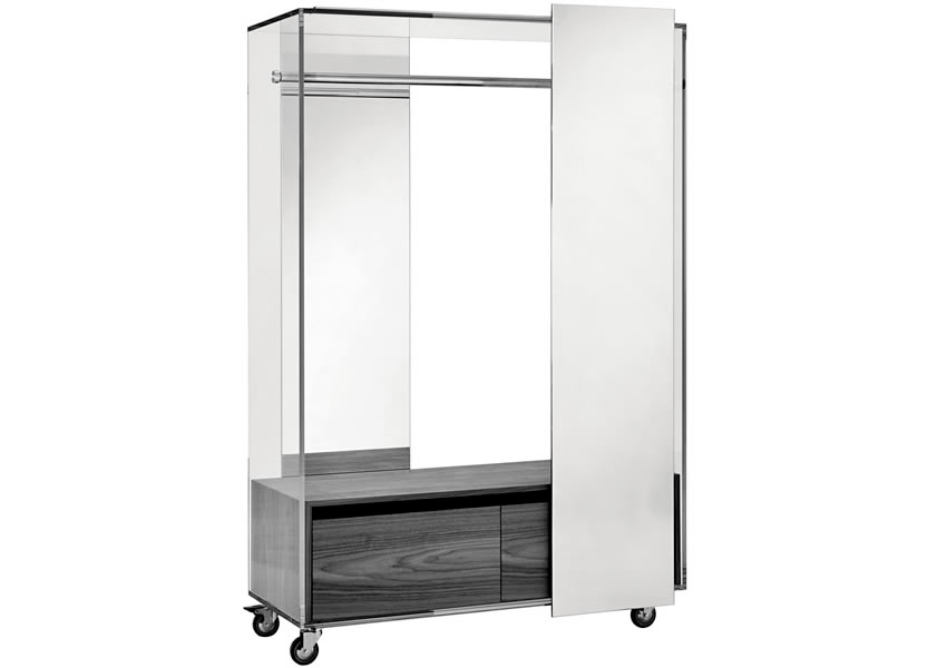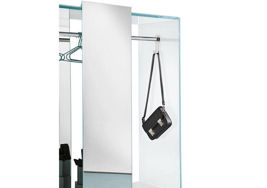 Guardaroba da ingresso o camera, con struttura in vetro dotata di anta scorrevole.