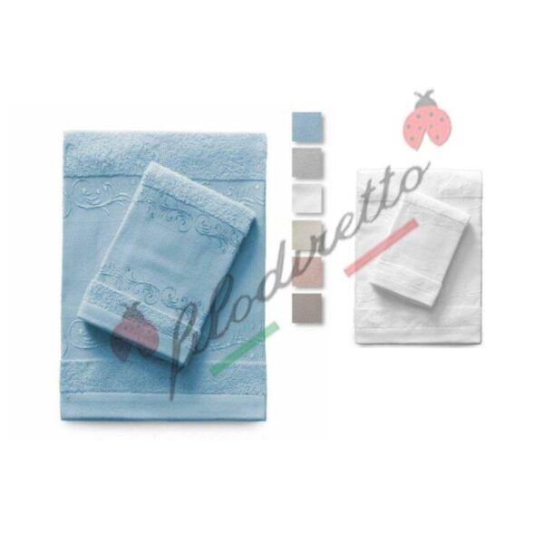 Dimensione: Asciugamano viso: 60×110 cm, Ascigamano ospite: 40×65 cm;