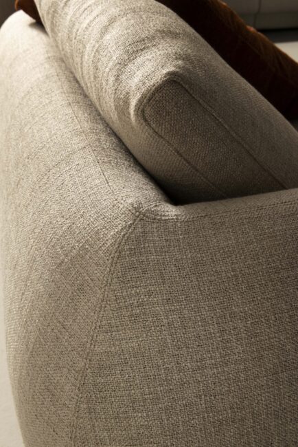 - Dal dettaglio dello schienale ad angolo, emerge la sua cura sartoriale nelle cuciture di pregio, nell’ergonomia di una forma “piena” che esprime alla sola vista la confortevolezza di un divano che dona accoglienza tra morbidi cuscini in BALTIMORA e cuscini decorativi in lino in nuances naturali.