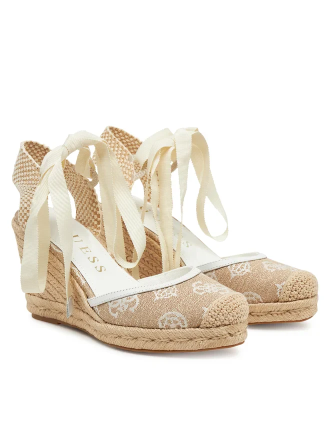 - Espadrillas eleganti in tessuto beige con zeppa, fibbia decorativa e lacci in raso.