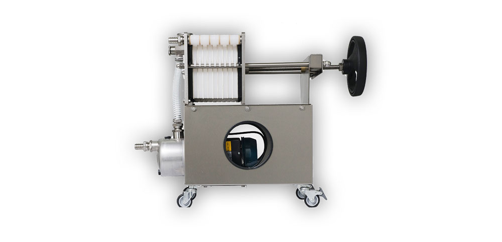 Filtro per filtraggio alimentare appartenente alla categoria “Professional”. Costruito con materiali di alta qualità e dalla struttura curata nei particolari, garantisce un’alta filtrazione del prodotto in maniera pratica e semplice.Si presenta con pompa e struttura completamente in acciaio Inox AISI 304, elemento imprescindibile per igienicità e durata, e con piastre in nylon lineare tra le quali vengono inseriti gli strati filtranti. Il filtro nasce per poter filtrare con 10 cartoni, ma può funzionare anche con un numero inferiore o con un numero superiore (fino al completo spazio).È dotato di manometro per il controllo della pressione e di una valvola per la regolazione del flusso. Il montaggio è extra-rapido, la sostituzione dei cartoni è immediata e le fuoriuscite di liquido risultano ridotte al minimo.