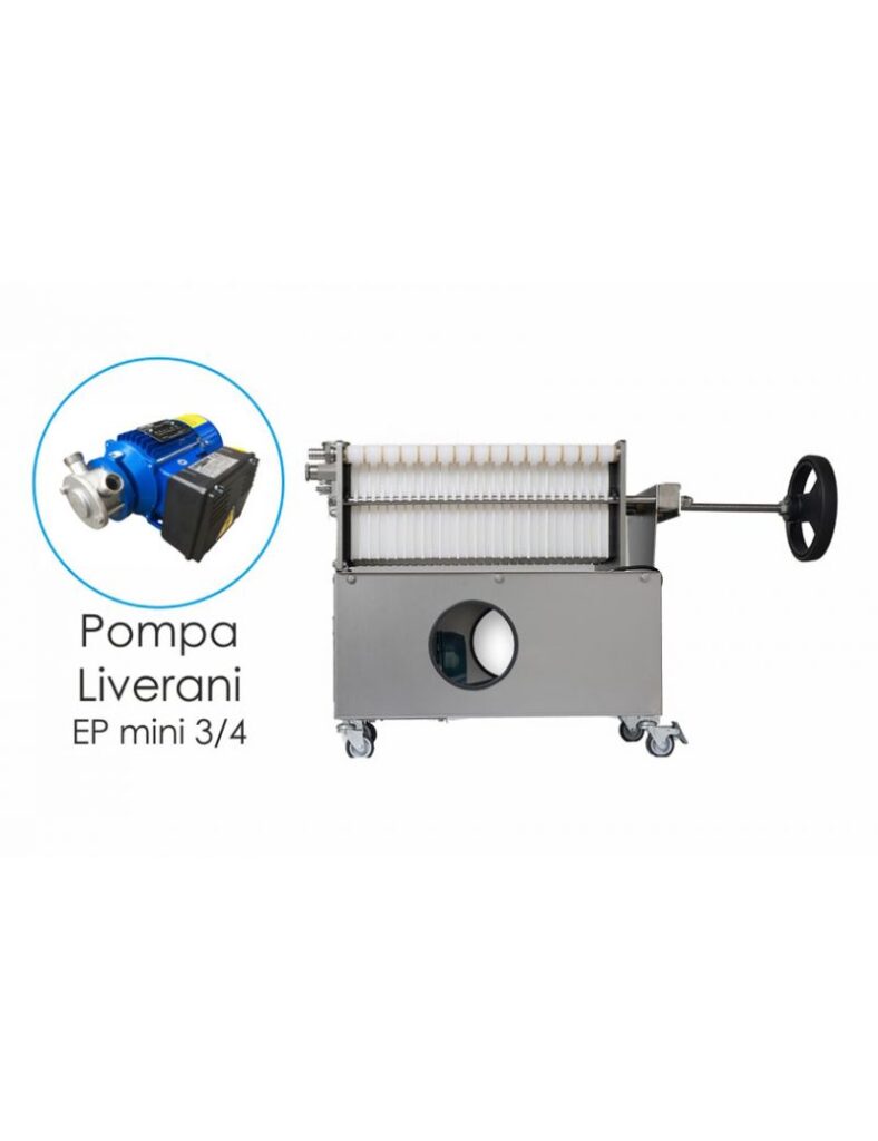 - Il filtro è montato su un carrello in acciaio Inox con ruote e possiede una vasca di recupero liquidi integrata.