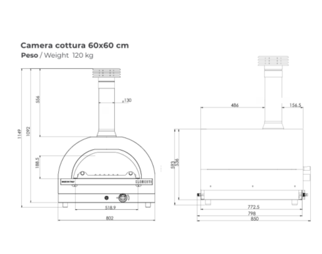 - Dimensioni Camera di Cottura: 60×60 cm (capacità di 2 pizze)