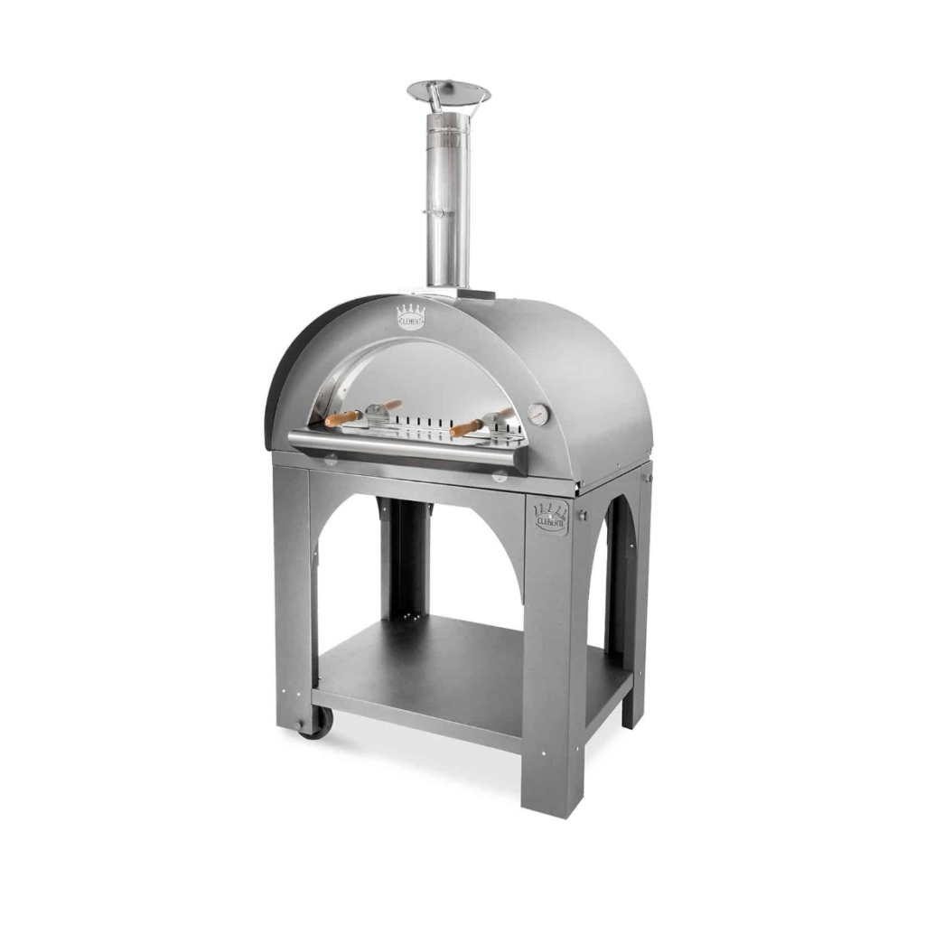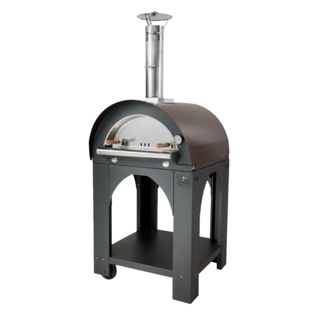 - Costruito con materiali speciali per resistere alle intemperie, questo forno può essere posizionato all’esterno e spostato facilmente grazie al carrello con ruote incluso.