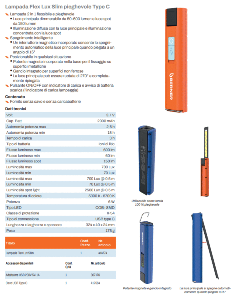 - Con la Lampada Flex Lux Slim, hai a disposizione un’illuminazione versatile, pratica e ad alte prestazioni per qualsiasi situazione.