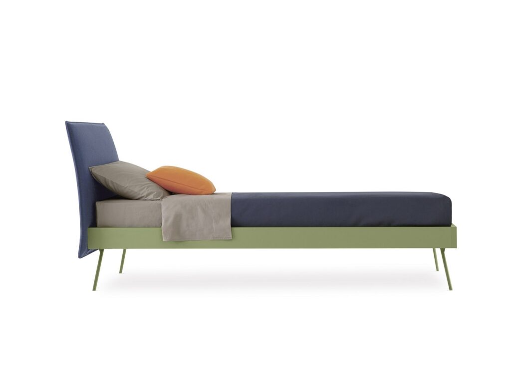 Il letto Flare ha la testiera imbottita. Si può combinare con le tante gambe a disposizione oppure attrezzare con una rete rialzante, sotto la quale riporre coperte, cuscini e biancheria da letto.