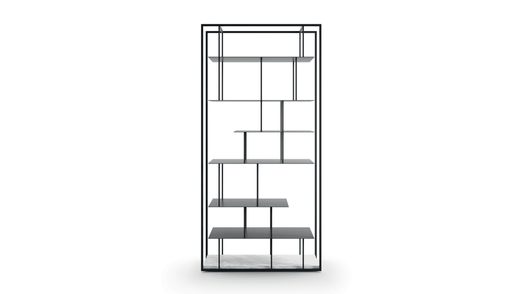 - I ripiani, sottili come dei fogli, vengono sospesi grazie a leggeri sostegni che disegnano un’alternanza di linee verticali ed orizzontali, racchiuse da una cornice ben definita.