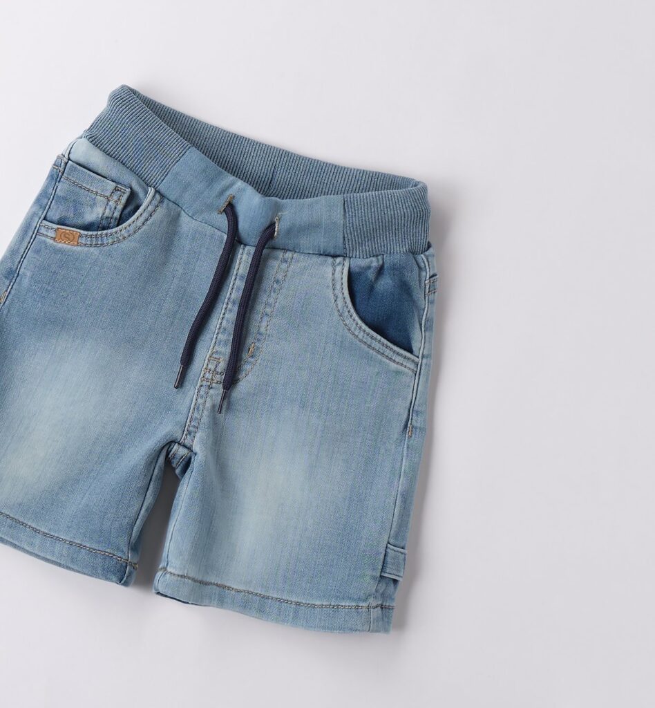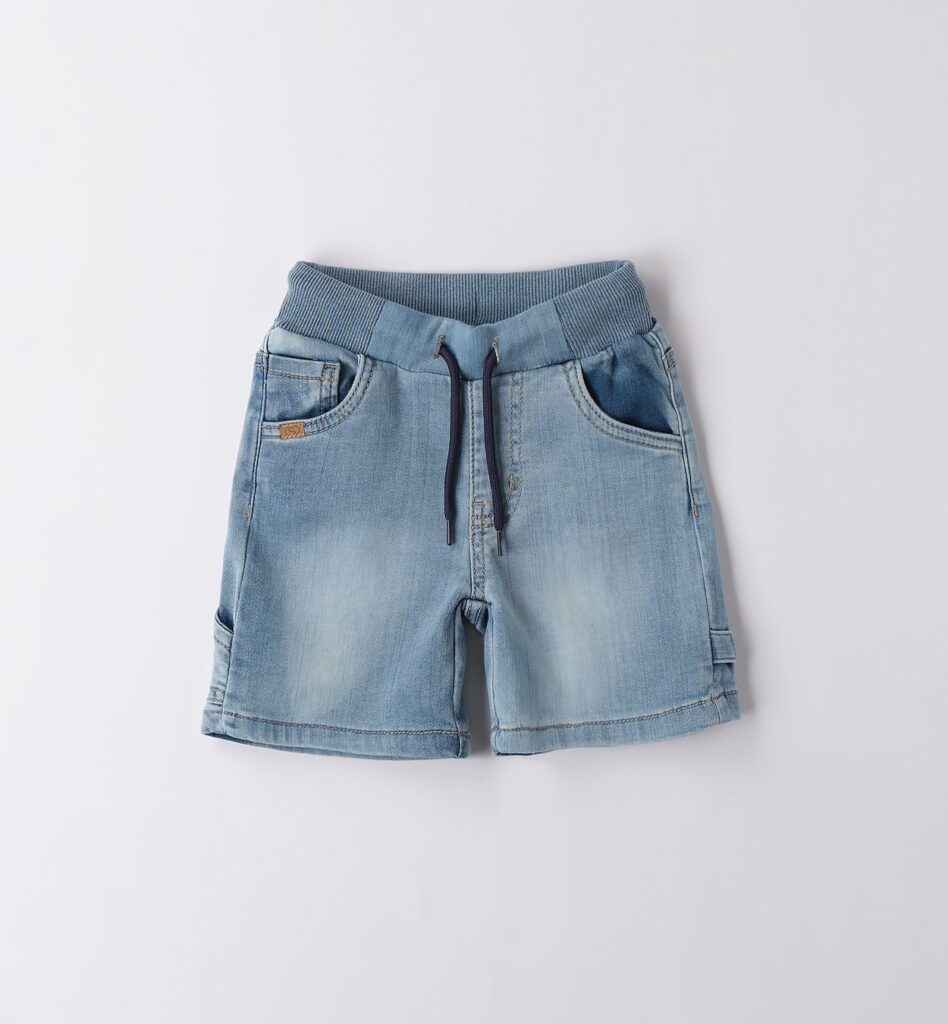 - Pantaloncino di jeans con elastico e laccetto in vita.