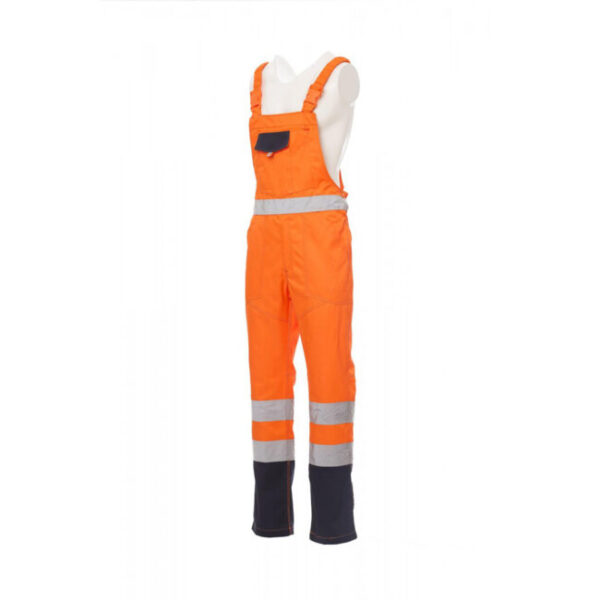 Pettorina alta visibilità con bande riflettenti ed ampia protezione renale, bretelle elasticizzate e fibbie con chiusura automatica, apertura laterale con bottoni, elastico in vita sul retro. Triple cuciture di rinforzo nel cavallo e interno gamba. Doppia tasca al petto di cui una con zip e anello di aggancio per porta badge, una con patta e un porta penne. Due ampie tasche anteriori di cui una con taschino portamonete, una tasca posteriore chiusa con patta e porta metro laterale destro.