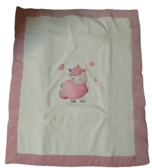 - Coperta morbida per neonati con bordo rosa e un tenero unicorno con cuore al centro.