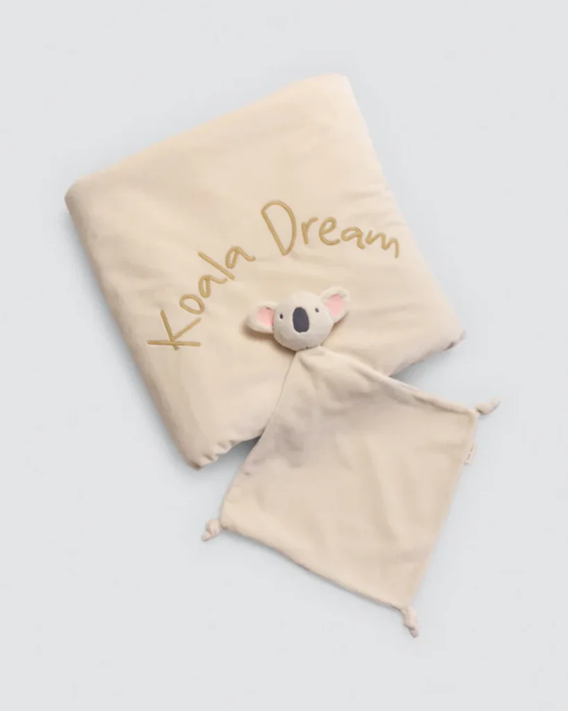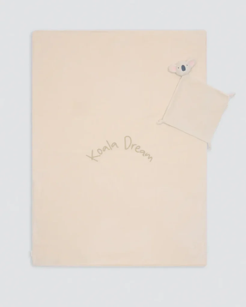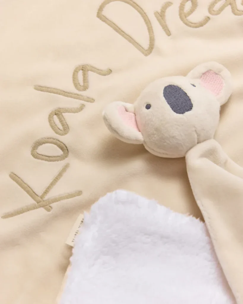 - Coperta Lussuosa: Realizzata in morbidissimo tessuto peluche color panna o beige chiaro. La coperta è di dimensione perfetta per la culla, il passeggino o per le coccole sul divano. È impreziosita dal ricamo “Koala Dream”, un tocco di eleganza discreta.
