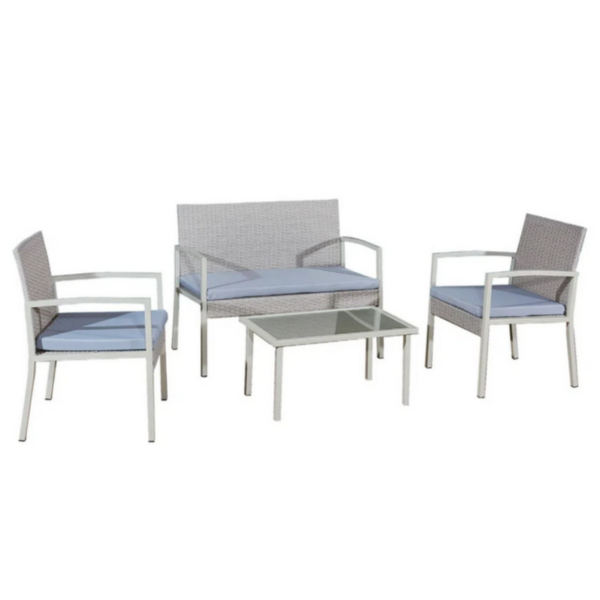 - Il set giardino in polirattan Eurialo è composto da un tavolino, un divano e due poltrone, offrendo una soluzione completa per arredare gli spazi esterni.