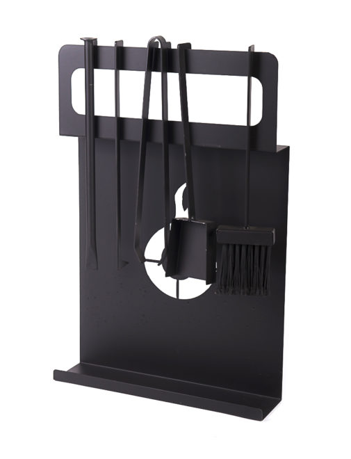 Set completo di attrezzi per la pulizia del camino: paletta, scopino, molla forgiata (pinza), attizzatoio, soffietto.