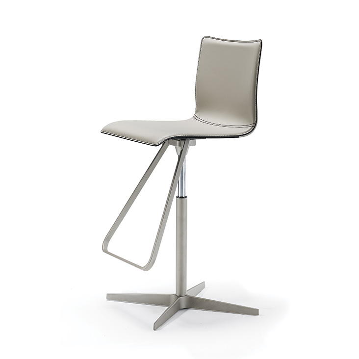 Sgabello ultraleggero regolabile in altezza e girevole con base a 4 razze in alluminio lucido, colonna, poggiapiedi e pistone a gas in acciaio cromato (08) o base, colonna, poggiapiedi verniciati goffrato nero (GFM73) o titanio (GFM11) e pistone a gas in acciaio cromato (08). Scocca rivestita in cuoio come da campionario. Cuciture standard o in contrasto.